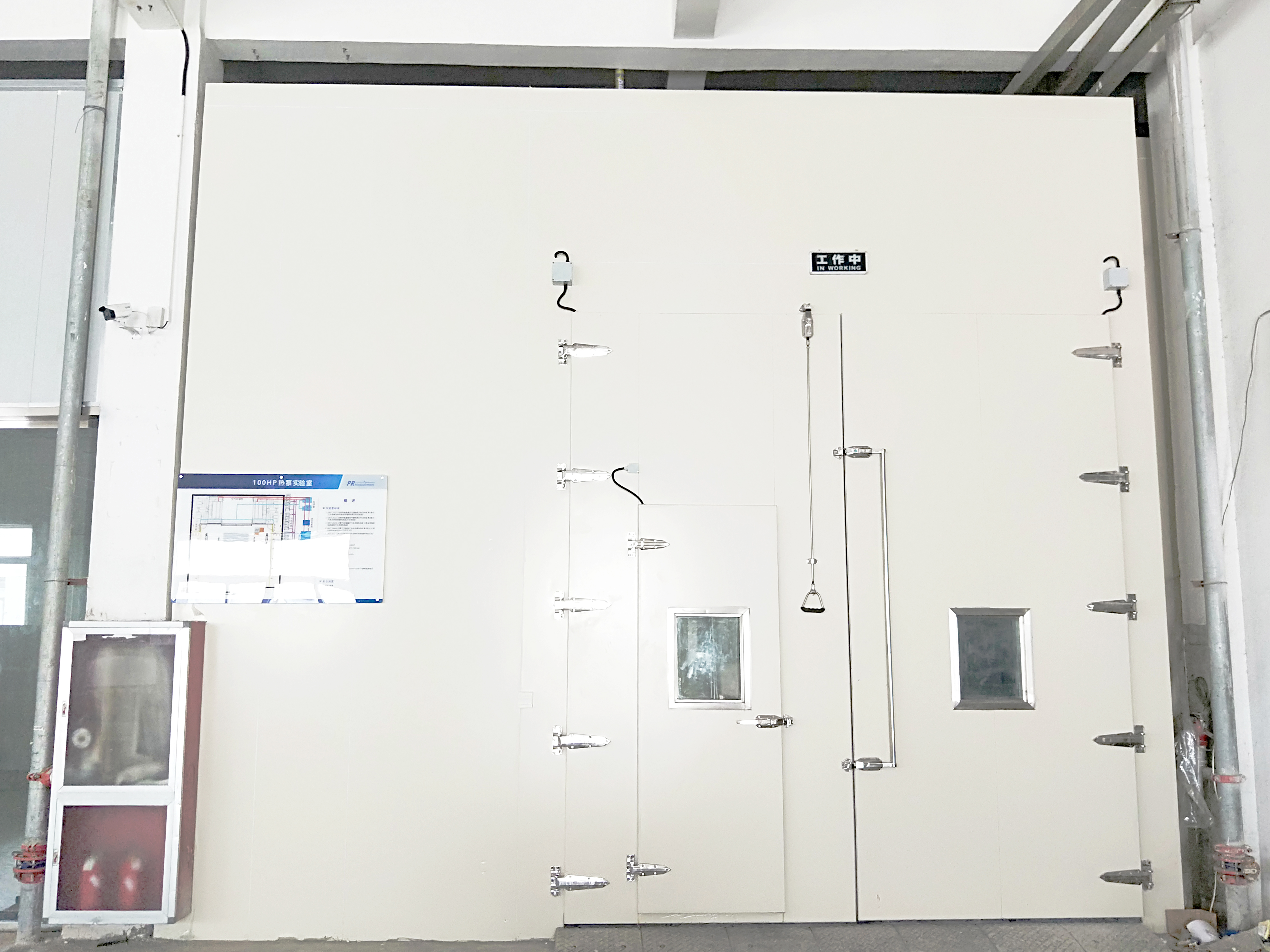 實驗室由環(huán)境室和控制室組成。其中,環(huán)境室包括空氣測試系統(tǒng)和水系統(tǒng),主要檢測產(chǎn)品在不同環(huán)境溫度及濕度下性能的穩(wěn)定性、可靠性、能效比等項目,采用國家工況測試與質(zhì)量檢測標準,滿足機組能力8-300KW、水流量范圍1.5~52m3/h、極限溫度-35℃—60℃、RH25%—92%的測試要求。控制室則能快速自動穩(wěn)定控制調(diào)節(jié)工況,確保溫度濕度達到國家標準的高精準度。同時應用冷熱回收專利技術,降低機組和電加熱等投入量;實現(xiàn)水系統(tǒng)混水閥設計,達到快速穩(wěn)定水溫的效果,全面提升產(chǎn)品節(jié)能性能。