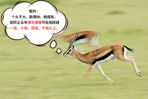 瞪羚”一詞緣自硅谷,“瞪羚企業(yè)”的概念誕生于20世紀90年代。創(chuàng)業(yè)企業(yè)跨越死亡谷、進入快速成長期被稱為瞪羚企業(yè),也被稱為高成長企業(yè)。它們具有與“瞪羚”共同的特征——個頭不大、跑得快、跳得高。這樣的企業(yè),成長速度快、創(chuàng)新能力強、專業(yè)領(lǐng)域新、發(fā)展?jié)摿Υ蟆?葡B鼘嵵撩麣w!