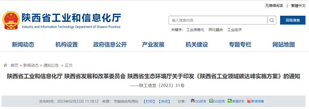近日,陜西省工業(yè)和信息化廳發(fā)布“陜西省工業(yè)和信息化廳、陜西省發(fā)展和改革委員會、陜西省生態(tài)環(huán)境廳關于印發(fā)《陜西省工業(yè)領域碳達峰實施方案》的通知”。