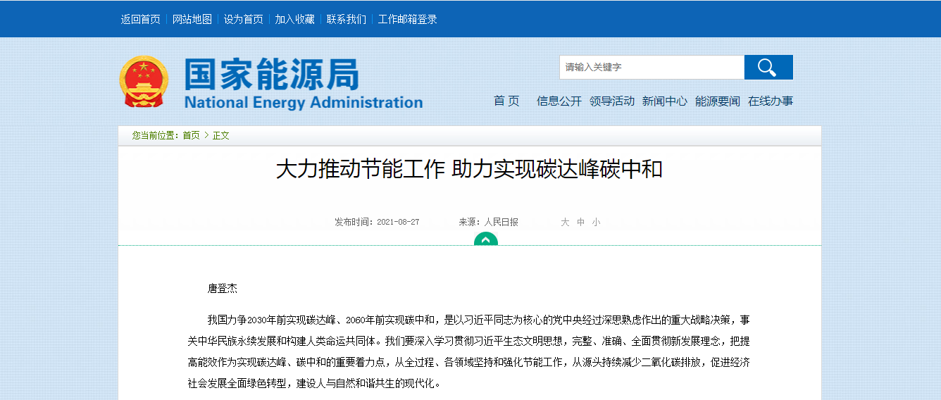 我國(guó)力爭(zhēng)2030年前實(shí)現(xiàn)碳達(dá)峰、2060年前實(shí)現(xiàn)碳中和,是以習(xí)近平同志為核心的黨中央經(jīng)過(guò)深思熟慮作出的重大戰(zhàn)略決策,事關(guān)中華民族永續(xù)發(fā)展和構(gòu)建人類命運(yùn)共同體。我們要深入學(xué)習(xí)貫徹習(xí)近平生態(tài)文明思想,完整、準(zhǔn)確、全面貫徹新發(fā)展理念,把提高能效作為實(shí)現(xiàn)碳達(dá)峰、碳中和的重要著力點(diǎn),從全過(guò)程、各領(lǐng)域堅(jiān)持和強(qiáng)化節(jié)能工作,從源頭持續(xù)減少二氧化碳排放,促進(jìn)經(jīng)濟(jì)社會(huì)發(fā)展全面綠色轉(zhuǎn)型,建設(shè)人與自然和諧共生的現(xiàn)代化。