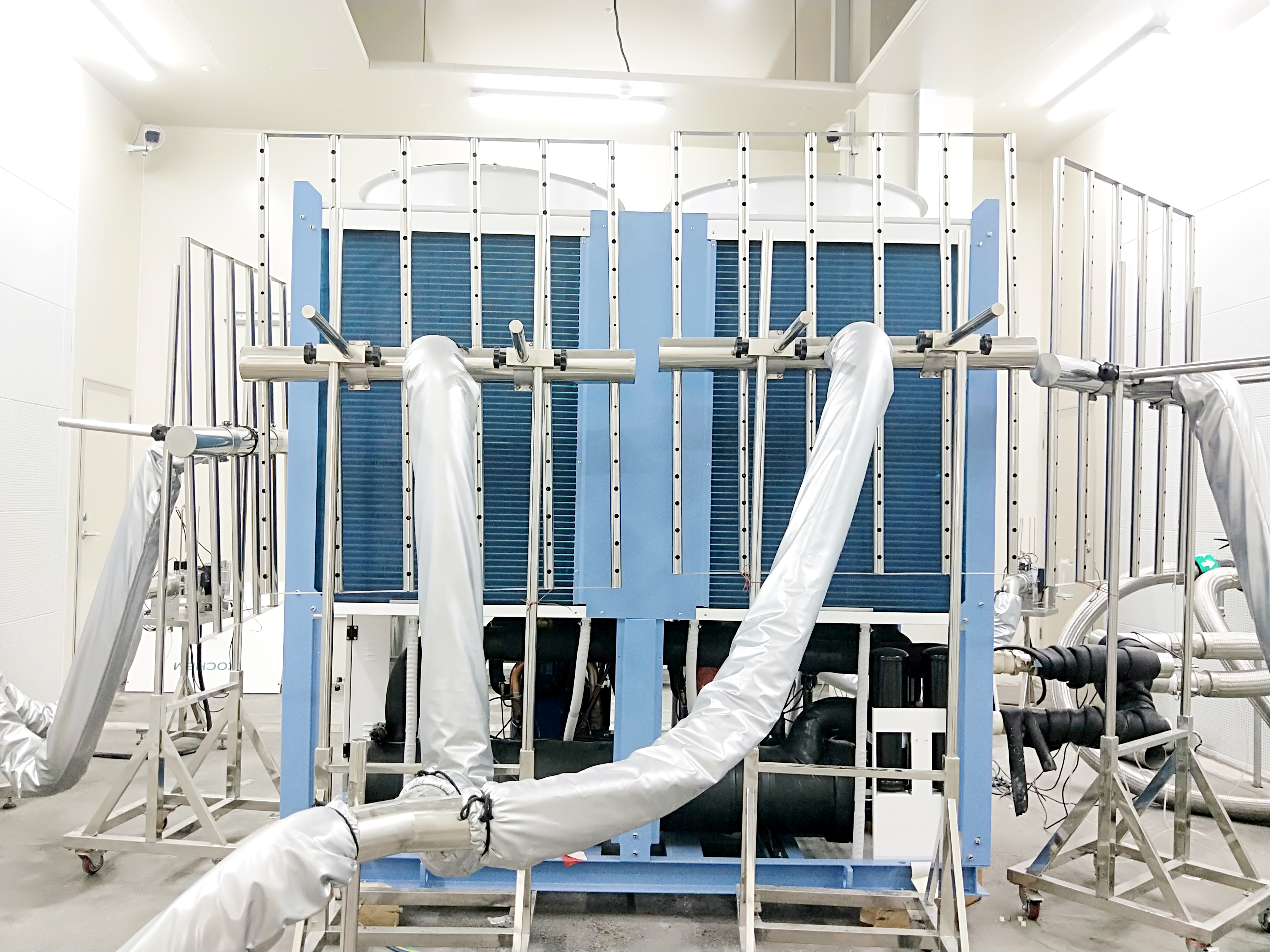 實驗室由環(huán)境室和控制室組成。其中,環(huán)境室包括空氣測試系統(tǒng)和水系統(tǒng),主要檢測產(chǎn)品在不同環(huán)境溫度及濕度下性能的穩(wěn)定性、可靠性、能效比等項目,采用國家工況測試與質(zhì)量檢測標準,滿足機組能力8-300KW、水流量范圍1.5~52m3/h、極限溫度-35℃—60℃、RH25%—92%的測試要求。控制室則能快速自動穩(wěn)定控制調(diào)節(jié)工況,確保溫度濕度達到國家標準的高精準度。同時應用冷熱回收專利技術,降低機組和電加熱等投入量;實現(xiàn)水系統(tǒng)混水閥設計,達到快速穩(wěn)定水溫的效果,全面提升產(chǎn)品節(jié)能性能。