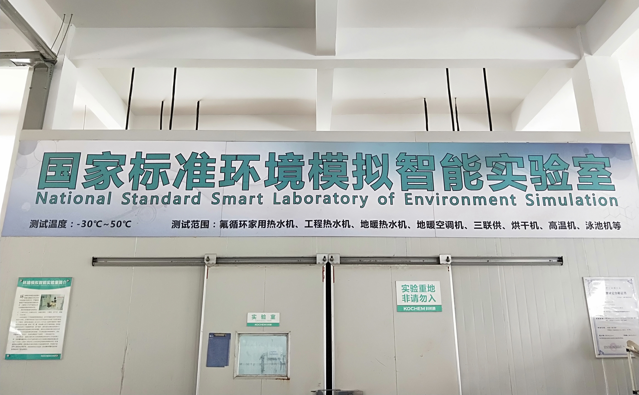 科希曼環(huán)境模擬實驗室達到GB/T 25127.1《低環(huán)境溫度空氣源熱泵(冷水)機組 第1部分:工業(yè)或商業(yè)用及類似用途的熱泵(冷水)機組》、GB/T 25127.2《 低環(huán)境溫度空氣源熱泵(冷水)機組 第2部分:戶用及類似用途的熱泵(冷水)機組》等國家標準規(guī)定實驗要求,成功通過國家認可實驗室評審。