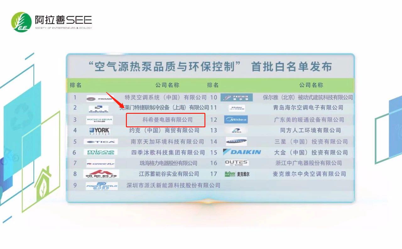 SEE第八屆中國(guó)企業(yè)綠色契約論壇上,房地產(chǎn)綠鏈行動(dòng)項(xiàng)目發(fā)布了多項(xiàng)項(xiàng)目成果,科希曼電器有限公司入選綠色供應(yīng)鏈?zhǔn)着G名單企業(yè)、“空氣源熱泵品質(zhì)與環(huán)保控制”首批白名單企業(yè)。