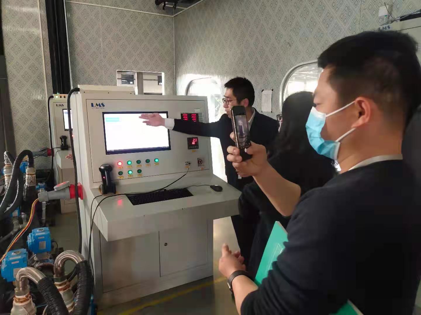 實驗室區(qū)域,來賓們對現(xiàn)場機器的調(diào)試運轉(zhuǎn)產(chǎn)生了濃厚興趣,左經(jīng)理親自上前進行示范解說,講解機器儀表盤內(nèi)各項參數(shù),讓來賓更了解空氣能。