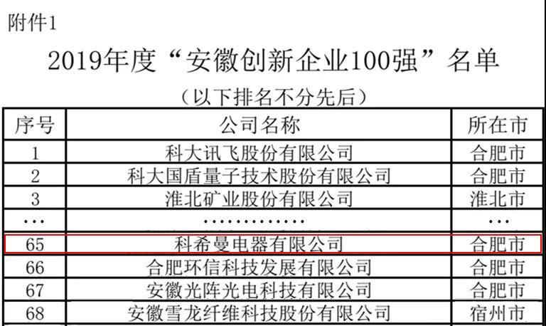 在省發(fā)展改革委、省科技廳、省經(jīng)濟(jì)和信息化廳、省科協(xié)、團(tuán)省委的指導(dǎo)下,由安徽省科學(xué)家企業(yè)家協(xié)會(huì)、中科院合肥技術(shù)創(chuàng)新工程院、安徽省院士專家聯(lián)誼會(huì)、安徽上市公司協(xié)會(huì)、安徽省青年企業(yè)家協(xié)會(huì)、華為技術(shù)有限公司、徽商銀行股份有限公司、安徽廣播電視臺(tái)經(jīng)濟(jì)生活頻道、安徽中國科學(xué)技術(shù)大學(xué)校友會(huì)共同主辦的2019年度“安徽創(chuàng)新企業(yè)100強(qiáng)”評(píng)選活動(dòng)在日前評(píng)選完成并予以公示,經(jīng)過組委會(huì)辦公室初選、銀行相關(guān)征信篩查、專家評(píng)審和組委會(huì)研究,科希曼電器有限公司榮譽(yù)入選2019年度“安徽創(chuàng)新企業(yè)100強(qiáng)”。