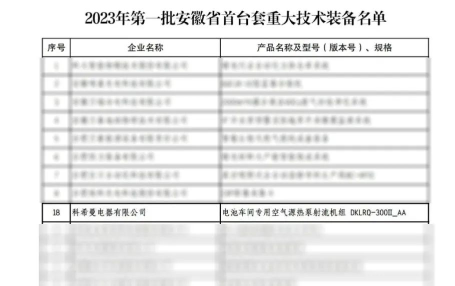 近日,安徽省評定了2023年第1批首臺套重大技術(shù)裝備,科希曼電器有限公司“電池車間專用空氣源熱泵射流機(jī)組”榜上有名。