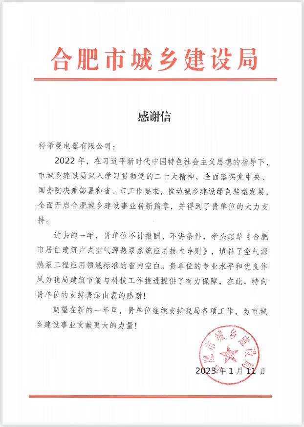 信中提到,在2022年度,科希曼主動擔(dān)當(dāng),不計報酬,牽頭起草了《合肥市居住建筑戶式空氣源熱泵系統(tǒng)應(yīng)用技術(shù)導(dǎo)則》,填補(bǔ)了空氣源熱泵工程應(yīng)用領(lǐng)域標(biāo)準(zhǔn)的省內(nèi)空白。科希曼的專業(yè)水平和優(yōu)良作風(fēng)為建筑節(jié)能與科技工作推進(jìn)提供了有力保障,對科希曼的支持表示由衷的感謝。